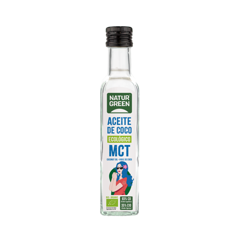 Aceite de coco MCT*. Ingredientes procedentes de agricultura ecológica.