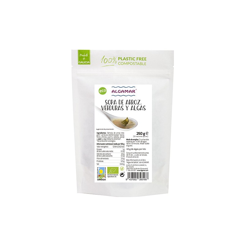 Sémola de arroz integral ecológica, verduras deshidratadas ecológica (zanahoria, chirivía, puerro, cebolla, perejil y apio), alga Wakame de Galicia.