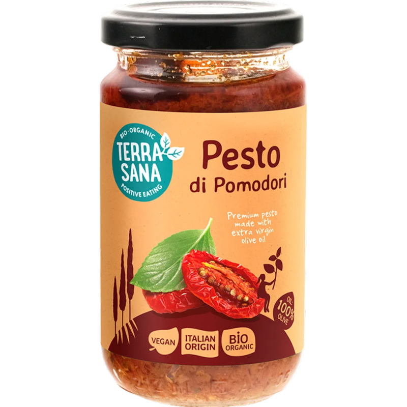 El pesto di pomodori se elabora en Italia a partir de tomates secos, aceite de oliva virgen extra, alcaparras, ajo y albahaca. Al igual que el pesto verde, esta variedad es 100% vegana. El Pesto di pomodori es como un tapenade de lujo. Delicioso como condimento en unos crackers o sobre una piadina. Está disponible en otras cuatro variedades: tradizionale, verde (vegano), rosso y ligure.
