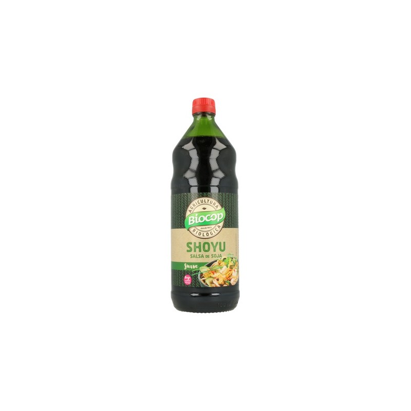 Salsa Soja Shoyu de Biocop con trigo de sabor suave y mediterráneo, ideal en la cocina.