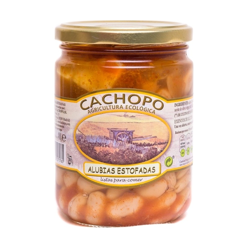 Alubia blanca de riñón, salsa (elaborada con agua, tomates, cebollas, aceite de oliva virgen extra, pimentón dulce y sal), patata y ajo.
