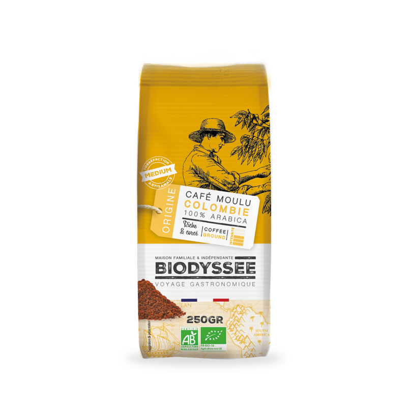 Café 100% Arabica (de origen Colombia) molido, tostado a mano y procedente de agricultura ecológica.