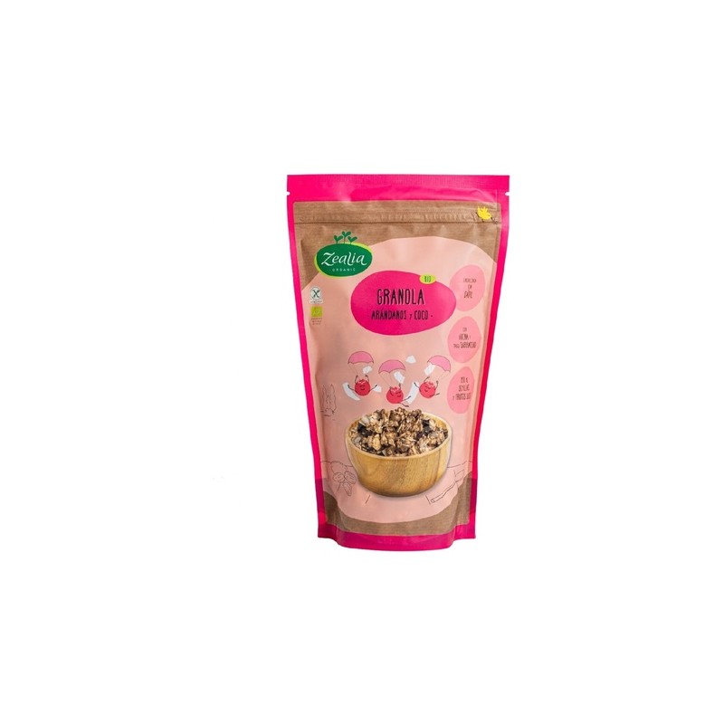 Avena sin gluten*, arándanos deshidratados* 14,3% (arándanos*, azúcar*, aceite de girasol*), mix de semillas 14% (SÉSAMO*, pipas de girasol*, chía*), dátil deshidratado*, coco* 6,1%, ALMENDRAS*, fibra vegetal prebiótica*5,1%, copos de trigo sarraceno* 5,1%, sal, canela*. *Procedente de la agricultura ecológica.