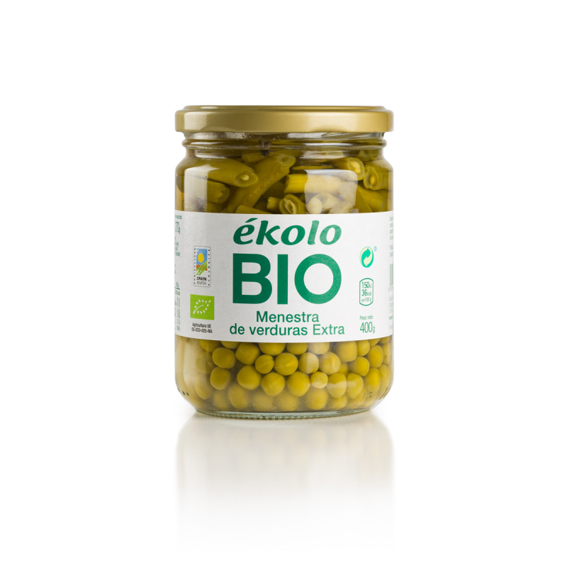 Guisantes, espárragos, alcachofas, zanahoria baby, judía verde y champiñones de agricultura ecológica, agua y sal.