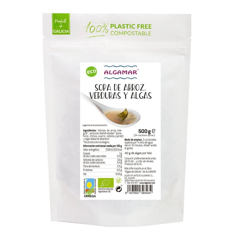 Sémola de arroz integral ecológica, verduras deshidratadas ecológica (zanahoria, chirivía, puerro, cebolla, col, perejil y apio), alga Wakame de Galicia.