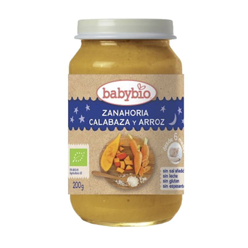 Verduras 63% (zanahoria 40%, calabaza 18%, cebolla), agua de cocción, arroz 8%, aceites vegetales vírgenes (colza, girasol), romero, perejil* (*) procedentes de la agricultura ecológica. 100% VEGETAL.