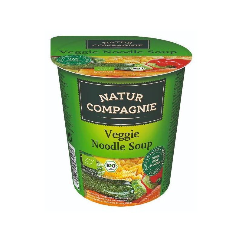 Pasta 63,5% (sémola de trigo duro), jarabe de glucosa de maíz, sal marina, almidón de maíz, azúcar de caña, extracto de levadura, tomate en polvo 2,7%, manteca de karité, zanahoria 1,8%, puerro 1,5%, cebolla 1,3%, jengibre, calabacín 0,4%, pimiento 0,4%, cúrcuma, hierba del aligustre, comino, ajo, perejil, macis, espinaca en polvo 0,04%, pimienta. De cultivo ecológico. *Procedente de la agricultura ecológica.