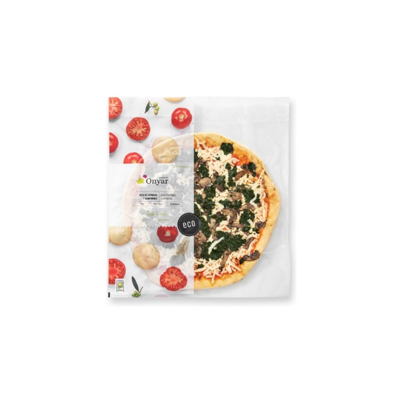 Harinas* ([trigo], maiz), mozzarella* ([leche] de vaca, cuajo, sal), espinaca*(17,5%), agua, champiñón*(7,5%), tomate*, aceite de oliva virgen extra*, sal marina, orégano* y levadura. Contiene [gluten]. Puede contener trazas de [cacahuetes, soja, frutos con cáscara, apio y sésamo]. (*) De agricultura ecológica