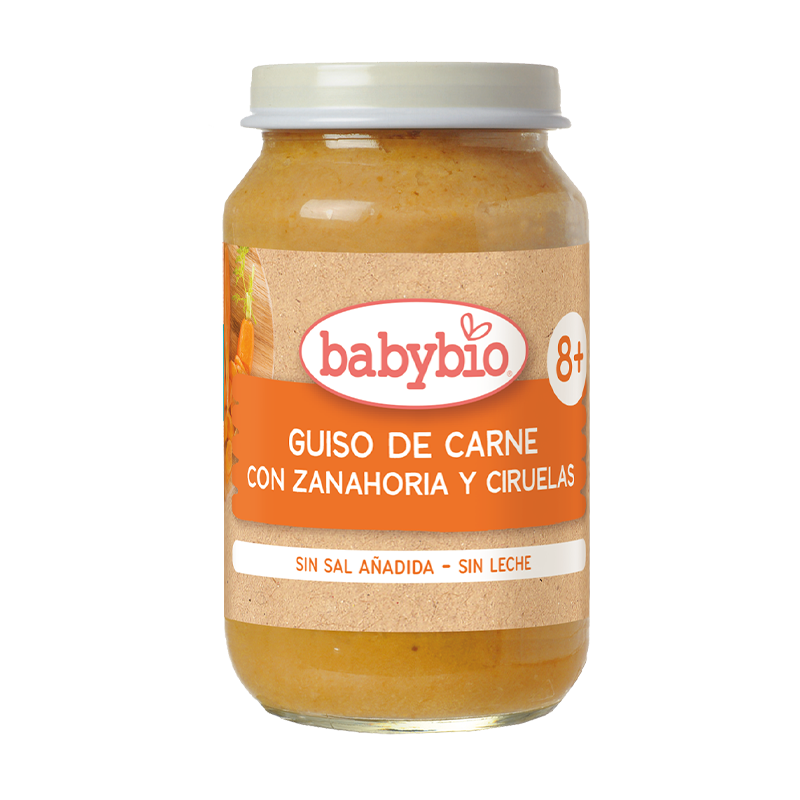 Zanahoria* 51%, agua de cocción, puré de ciruelas* 9% (ciruelas* 4.5%, agua), buey* 8%, cebolla* 7%, bulgur* 3%, aceites vegetales* (colza*, girasol*)