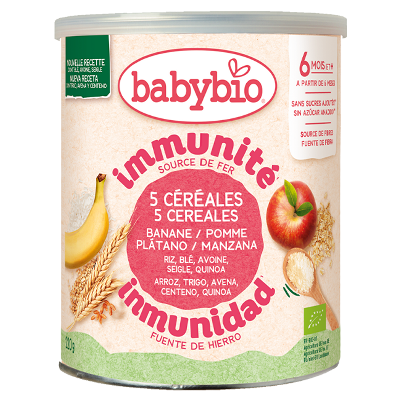 Harina de arroz* 41%, harina de trigo* 27%, harina de avena integral* 9%, copos de plátano* 8,6%, harina de trigo integral* 4,5%, harina de centeno integral* 4,5%, harina de quinoa* 4%, copos de manzana* 1%, hierro, vitamina B1.