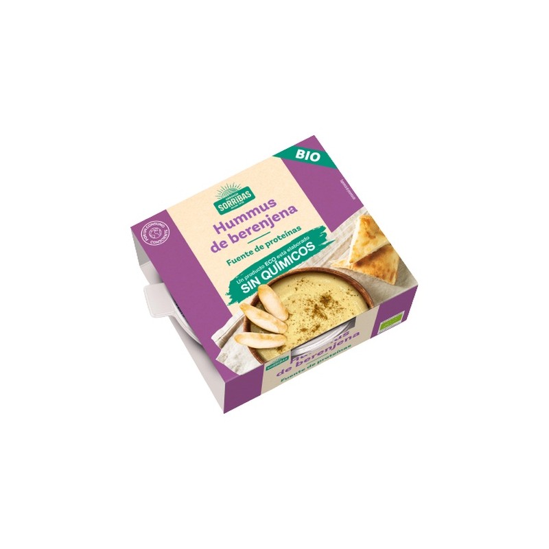 Garbanzos cocidos* (55%): (garbanzos*, agua), berenjena asada* (15%), aceite girasol*, tahín tostado* (puré de sésamo tostado*), aceite de oliva*, zumo de limón*, sal marina, ajo*, perejil*, cilantro polvo*, pimienta blanca*. *Procedente de la agricultura ecológica.