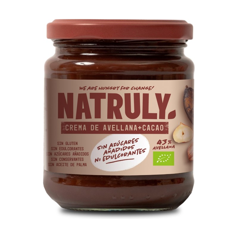INGREDIENTES: Pasta de Avellanas (43%)*, fibra de agave (inulina)*, grasa láctea (leche), cacao desgrasado en polvo (10%*), emulgente lecitina de girasol. Procedente de agricultura ecológica.